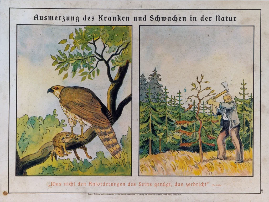 Dat wereldbeeld is ook zichtbaar in alledaagse propaganda uit de nazi-tijd. Op schoolplaten en in tijdschriften wordt de ideologie verbeeld als natuurwet: het sterke moet zegevieren over het zwakke. Op een Duitse schoolplaat uit de jaren dertig, met het onderschrift “Was nicht den Anforderungen des Seins genügt, das zerbricht”, ziet men links een roofvogel met zijn prooi, rechts een boer die een zieke boom omhakt. De titel luidt: “De uitroeiing van het zieke en zwakke in de natuur.”